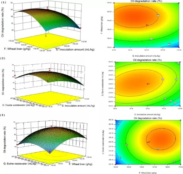 以麦麸、猪粪等农业废弃物为原料,山东建筑大学市政与环境工程学院武道吉团队选择了两株高效降解油脂的菌株,对石油污染土壤进行生物修复。实验结果表明,菌株A与菌株B的最佳配比为7:3。猪场废水可作为氮源的替代品和生物修复的工艺用水。其次,采用Box-Behnken设计对培养基进行优化,最佳培养基为:微生物投加量97ml/kg,麦麸投加量158g/kg,猪场废水投加量232ml/kg。在最佳培养基下,40d后油脂降解率达68.27±0.71%,土壤脲酶、过氧化氢酶和脱氢酶活性均提高,人工堆肥微生物数量显著增加。这些研究为减少农业废弃物的污染、探索了石油污染土壤生物修复的新模式奠定了基础。